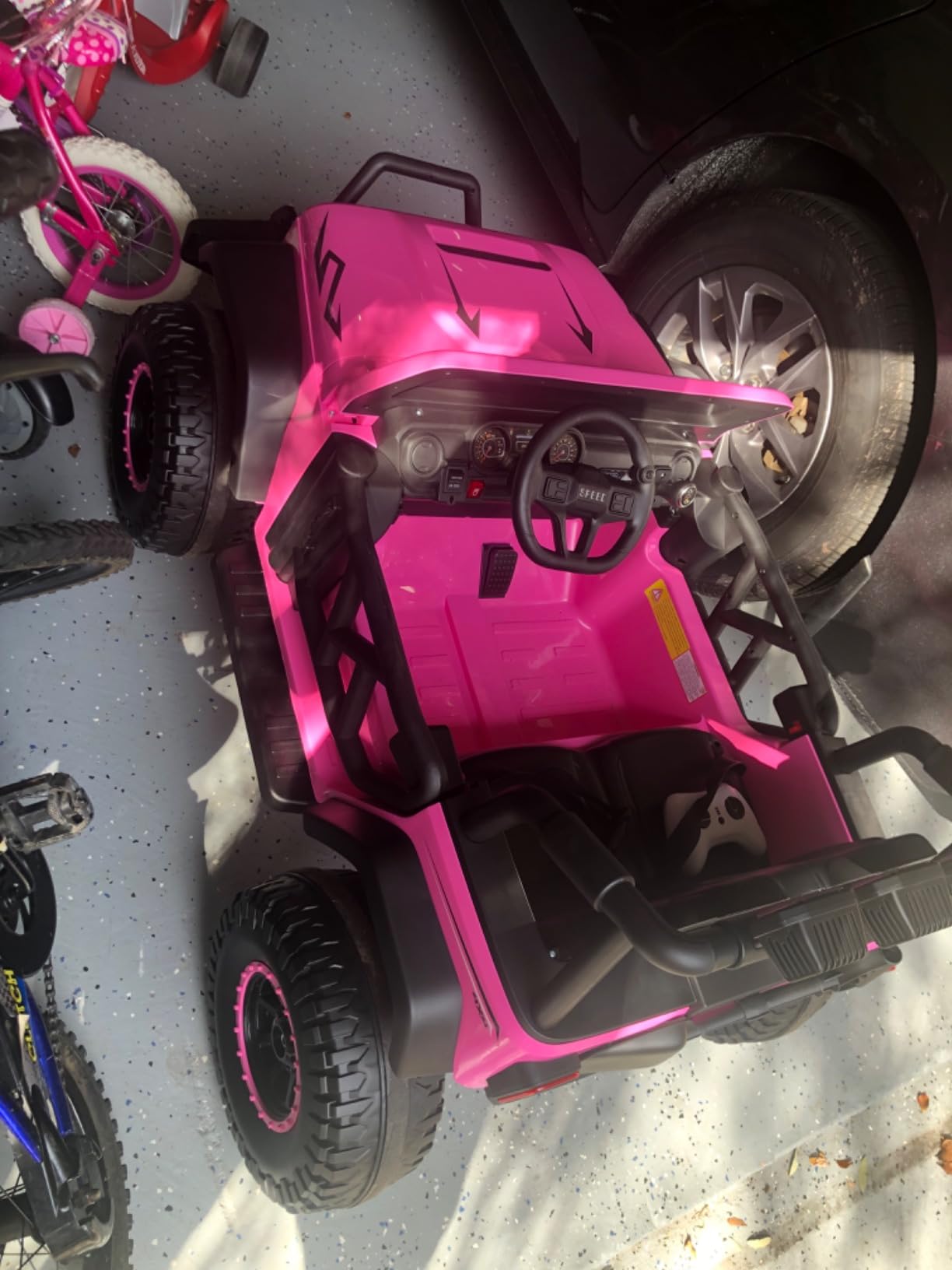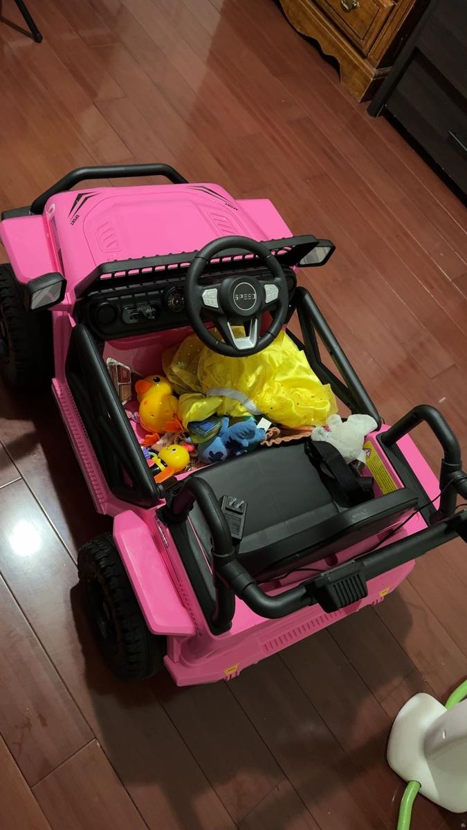 My kids love to ride in this toy jeep. It has three speeds and it steers well. It can go both forward and backward, and it has a remote control, which is useful when a parent wants to take control. Either way, the kids love the ride!