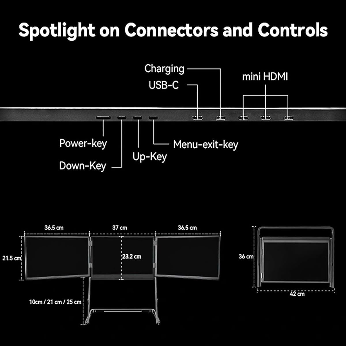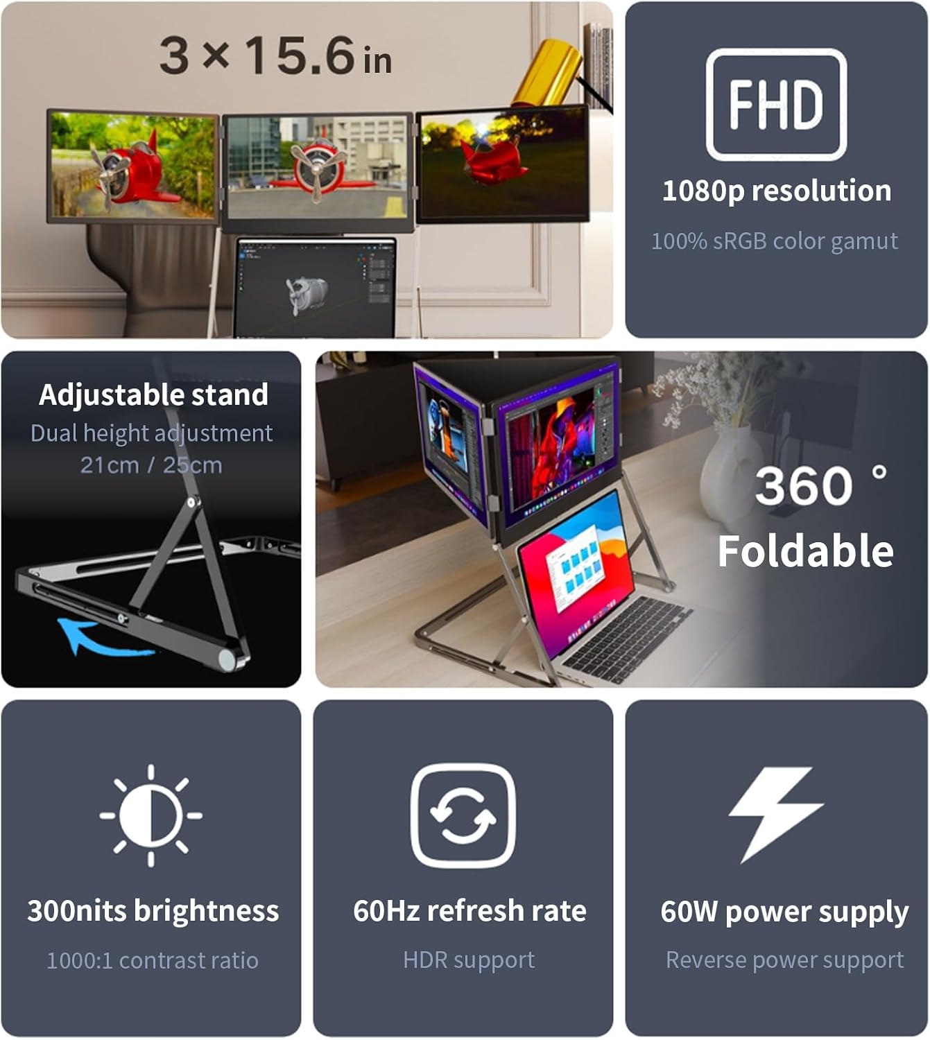 🌟1080P Full HD Triple Screens 3×15.6-inch IPS displays with 72% NTSC wide color gamut + HDR deliver crystal-clear, lifelike visuals. Ultra-narrow bezels + one-touch brightness/contrast adjustment, multi-angle tilt and swivel for enhanced viewing comfort. 💡Multi-screen productivity solution Three independent displays handle work, meetings, and learning simultaneously, minimizing page switching for enhanced efficiency. Ideal for professionals, gamers, and creators. 🎒Innovative folding design Lightweight chassis folds to single-screen size for easy portability. Quick setup + compact storage adapts to home, office, or travel scenarios, supporting solo use or collaborative sharing. ⚙️Universal compatibility + versatile ports Works with Windows/Mac/Linux/Android; plug-and-play with USB drive drivers. Connect three screens via: Single USB-C (requires DP Alt Mode) / USB-C + HDMI hybrid / Three independent HDMI ports 📦Complete accessories + after-sales support Includes portable display, charging/data cable, HDMI adapter, 65W PD adapter, USB drive, manual, premium packaging box + vertical felt laptop case, with dedicated customer service available anytime.
